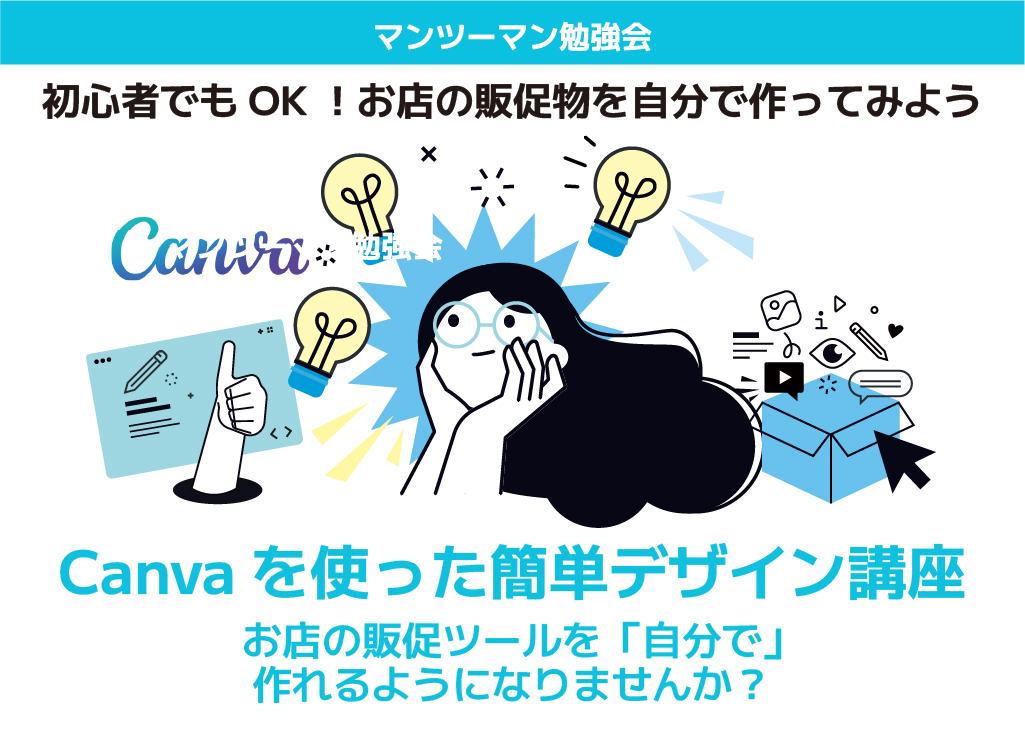 この講座では、無料デザインツール「Canva」を使って、名刺・チラシ・POPなどの販促物を作る基本を学びます。